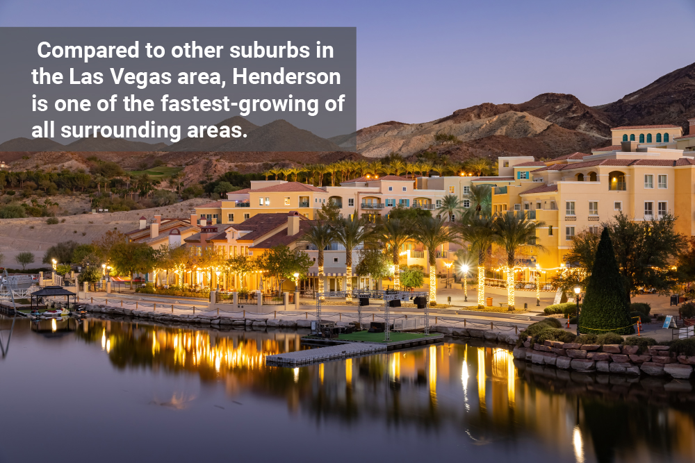 Like other suburbs in the Las Vegas area, Henderson has its own distinctive personality and features. Henderson is a top pick for families who appreciate its low crime rates, quality schools, and the fact that it is close enough to reach Las Vegas easily but is still a separate place. Henderson is also a popular choice for young professionals due to job availability and relatively affordable cost of living compared to other metro areas in the country. Historically, the labor force of Las Vegas has stuck close to the main city, but housing demand is increasing in Henderson and the surrounding suburbs.